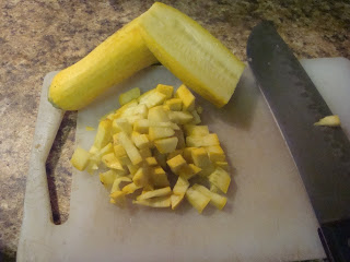 While my pan is heating I typically dice up my squash. By the time I’m done, my pan is nice and hot. I then lower the heat to medium and add squash and onions. Sautee until they are softened and then add garlic.
