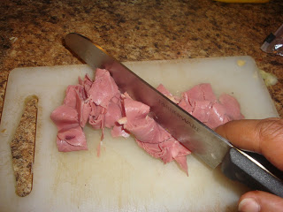 While all THAT is cooking, I cut up my deli corned beef. Then once the veggies are done I add it into the veggies well.