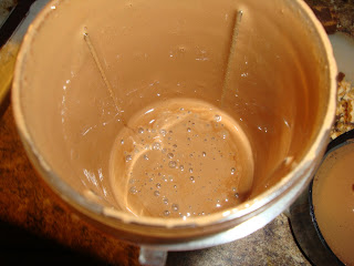You put your milk, protein powders and Splenda in your blender cup and blend for two minutes (yes, two whole minutes!). Then you add the ice and blend again. I will tell you this is not an easy feat. You are not giving your blender much liquid to work with.