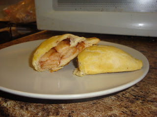 4. Roll each piece of dough out with a rolling pin. Lay on a sprayed cookie sheet and fill half with apple mixture. Fold over into a pocket, pressing down around the edges. If you want, you can mark the edges with a fork for visual appeal.