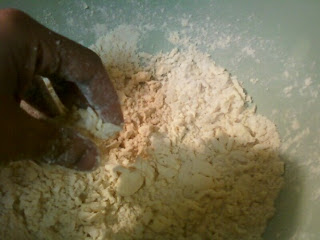 Step Two: Cut in the butter. It is IMPORTANT that the butter be cold. I usually freeze my stick of butter and cut it into cubes. I use a biscuit cutter but you can also use a food processor. Mix the flour mixture and butter until it is the consistency of small peas (although mine look more like dandruff…just sayin..)