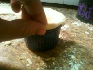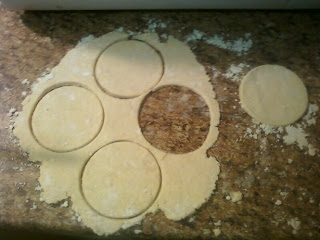 Cut your dough ball in half (it takes half the dough ball to make the crusts for four pies). Using a rolling pin, roll your dough out to the desired thickness. Use the appropriate size biscuit cutter to form a round disc (my ramekins required a medium biscuit cutter).