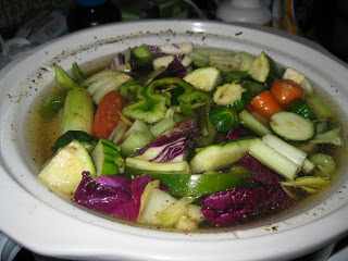 Directions: Add the vegetables to the crock pot, then cover completely with water. Add the seasonings and top with the herbs. Stir together, then cook on high for 2 hours just to bring it to a good simmer.
