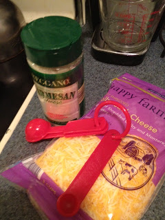 Choose your cheese(s). You can use one type of cheese or several. You can also add things in. I like spicy stuff, so I’ve done Mexican blend with a pinch of ground Chipotle pepper in it. I’ve done Parmesan/Romano (with a teeny bit of mozzarella) with a pinch of Italian spices. Let your imagination go wild! Here I did Colby Jack and Parmesan. It’s an unlikely combo but then I’m an unlikely girl π