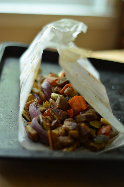 You simply fold the parchment paper over top of the veggies to make a happy little tent. (RIP Bob Ross!)