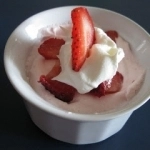 Stir the berry pieces into the yogurt mixture until completely incorporated. Pour the mixture into a 4 ounce ramekin, top with the remaining 1/2 tablespoon of whipped topping and the strawberry slice. Enjoy!