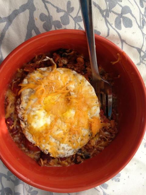 S’anyway, that’s my breakfast spiel. Now…what the HELL is that a picture of? It was my Sunday breakfast which was a serving of my Turkey TVP chili (which I made EXTRA spicy since I was home alone this weekend) with one pan-fried egg, over medium, on top).