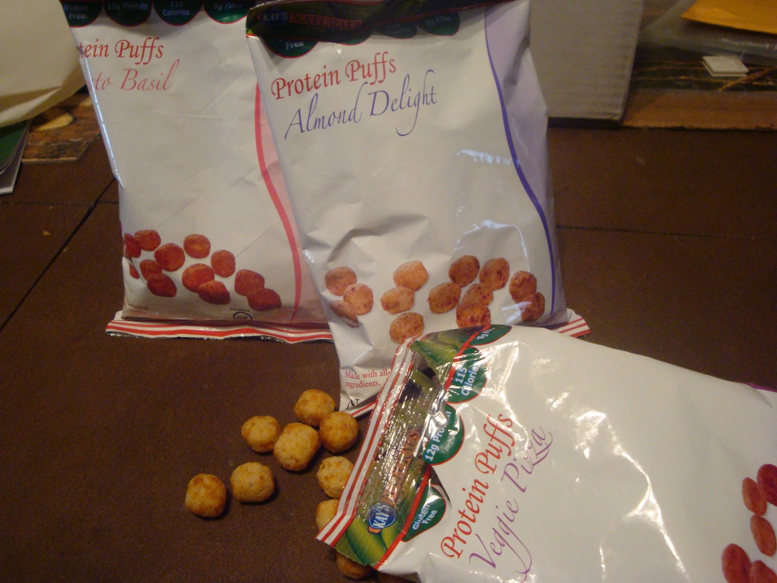 There are three flavors of the protein puffs: Almond Delight, Tomato Basil and Veggie Pizza.