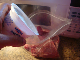 Then combine it in a zip-top bag with Greek yogurt and any desired “special” spices (for instance, if you are doing a Mexican dish you might add cumin and coriander, Indian you might add your ginger and garlic, Chinese you might add soy sauce and pepper flakes, etc.)