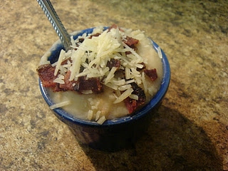 For the “meat and potato” lovers in the house…this soup will help with the craving for a loaded baked potato. For newbies, omit the bacon pieces and mix in a Laughing Cow Light wedge or a sprinkle of yoru favorite finely shredded cheese while it’s still hot for a yummy, puree-stage approved treat! For added protein, you can mix in a scoop of unflavored protein while cooking.
