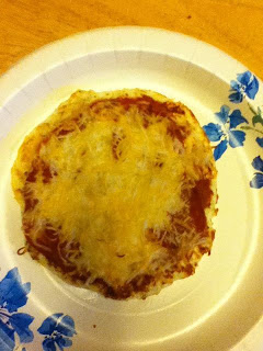 Add a bit of pizza sauce, 4 slices pepperoni, and top with the remaining cheese.