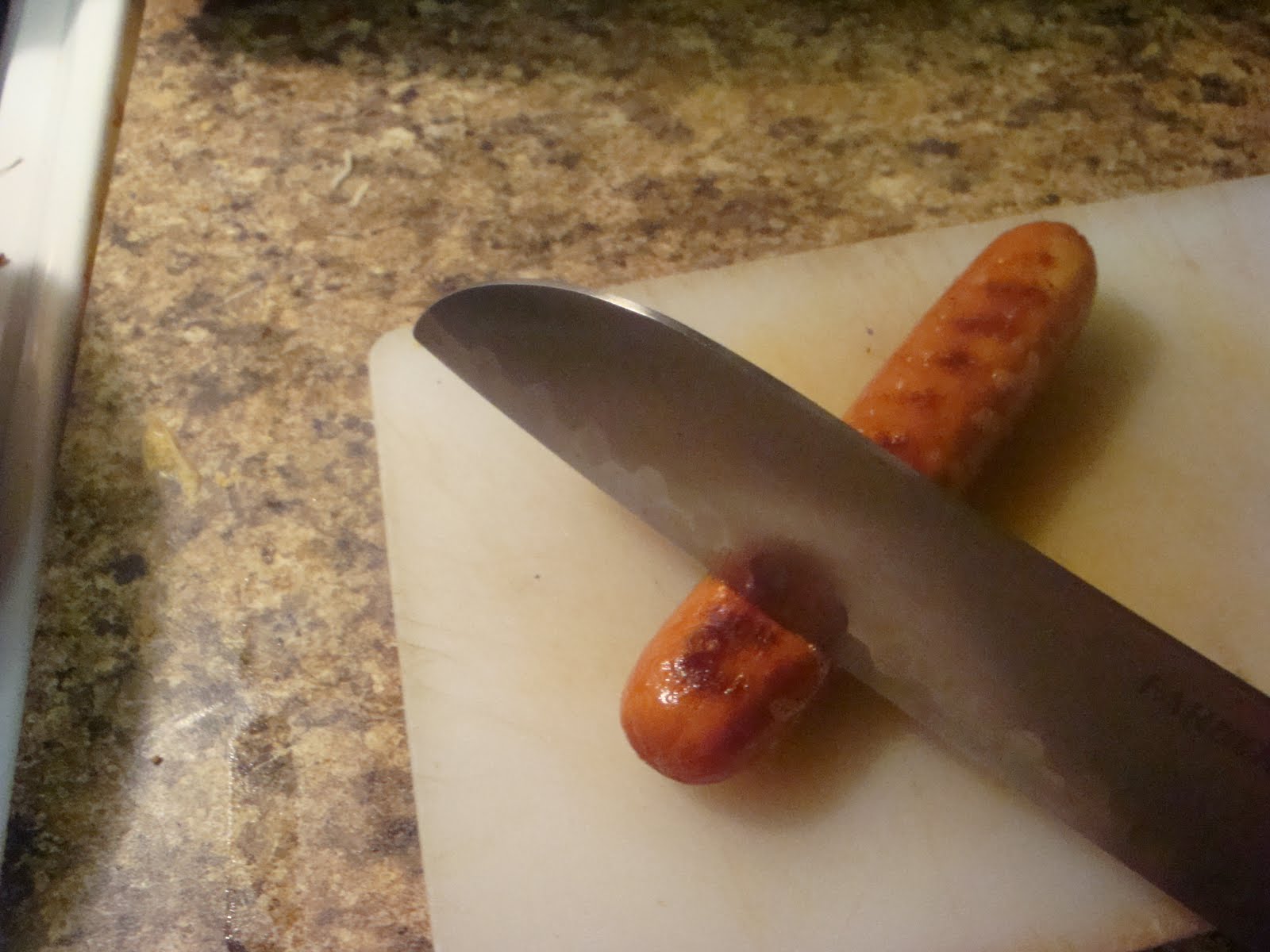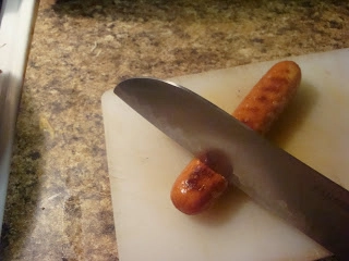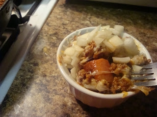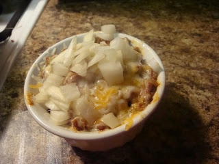 Basically I cut my hot dog into pieces (for newbies you might use half a dog and dice it instead of slicing it), put those pieces into my ramekin, covered it with chili, covered that with some cheese and let it melt then covered the whole thing in diced onions. NOM!