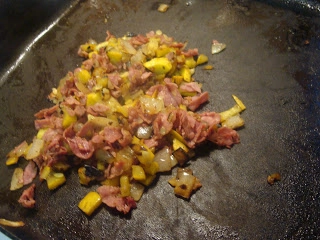 While all THAT is cooking, I cut up my deli corned beef. Then once the veggies are done I add it into the veggies well.