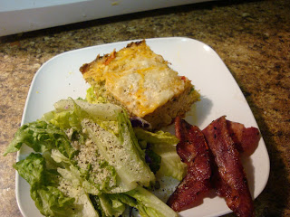 The above picture, I should say, is totally for show. What I ended up doing with it was this. I ate 3/4 of that slice of casserole, distributed the other 1/4 between two kitties-who-shall-not-be-named (cough…Niobe and Socks!) who wouldn’t leave me alone once they smelled crab. I did have the little green salad on the side and that is one slice of turkey bacon cut in three and I had that too.