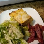 The above picture, I should say, is totally for show. What I ended up doing with it was this. I ate 3/4 of that slice of casserole, distributed the other 1/4 between two kitties-who-shall-not-be-named (cough…Niobe and Socks!) who wouldn’t leave me alone once they smelled crab. I did have the little green salad on the side and that is one slice of turkey bacon cut in three and I had that too.