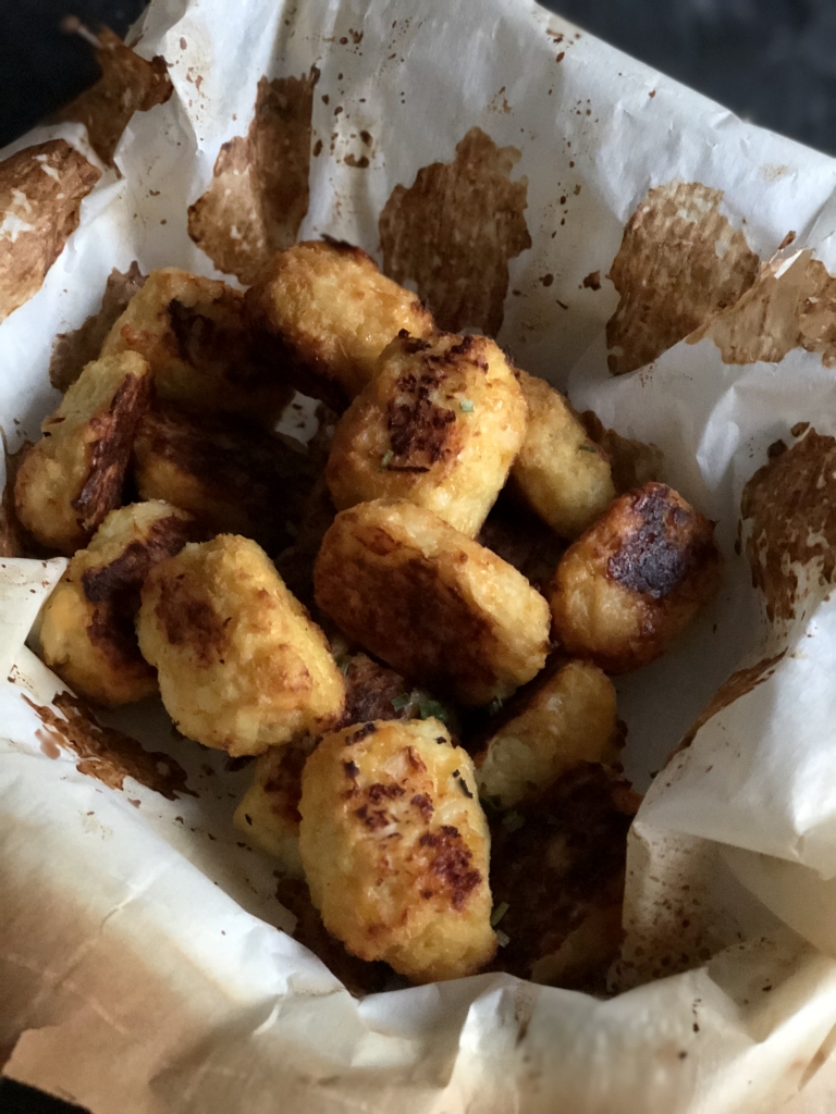 That’s one other important note. Whenever you are faux frying something (anything) you need heat. Don’t be afraid of temps above 425 for oven frying! In this case, the heat is helping in several ways: it evaporates that leftover water (which I bet you will see and feel as you mold your tots) and it ensures a nice, crisp, brown outside.