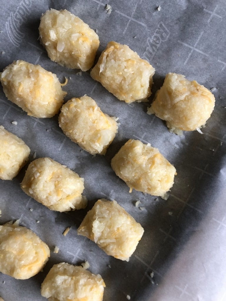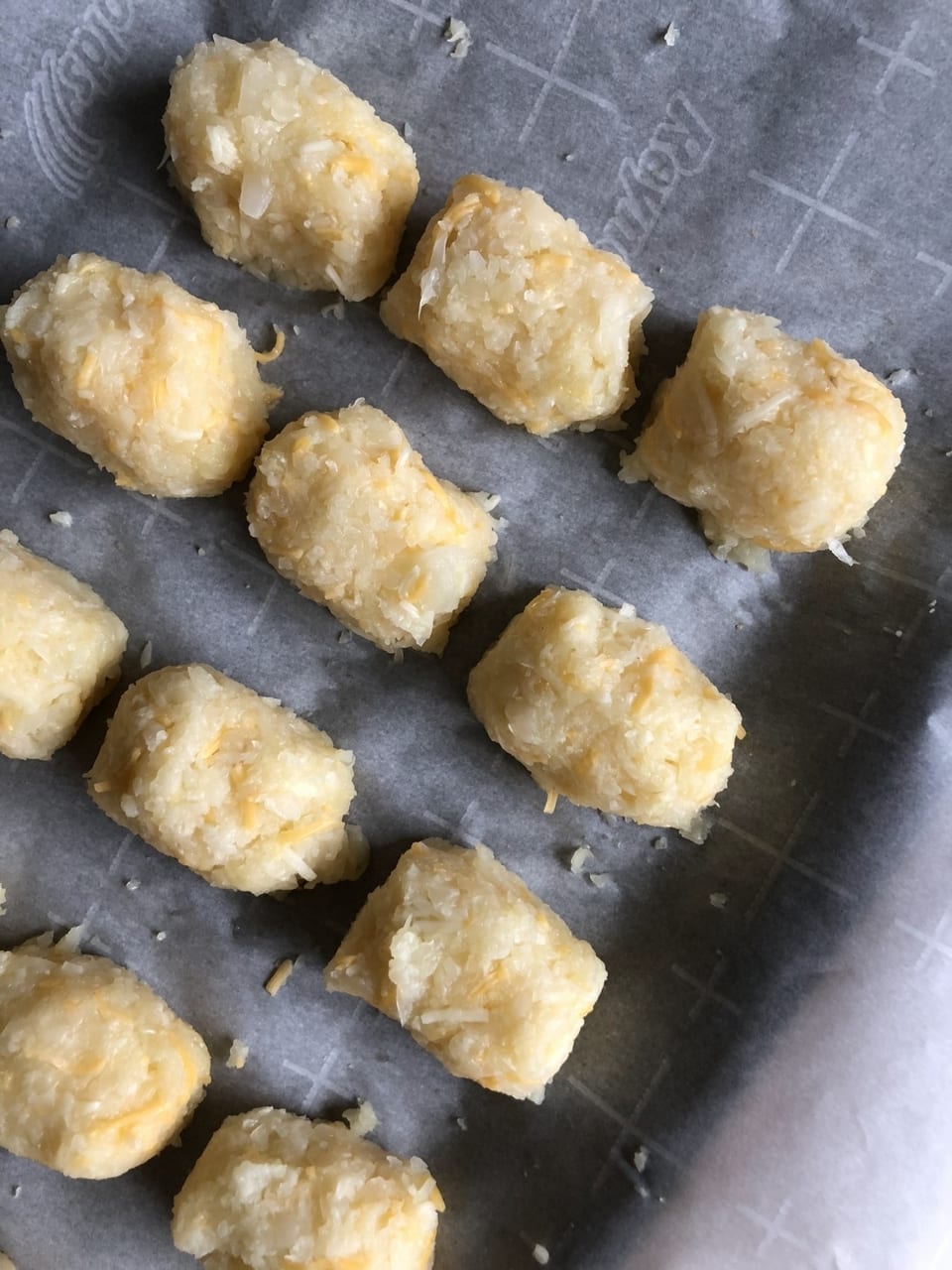- Line a cookie sheet with parchment paper. Using a melon baller or small scoop, portion out mixture into the palm of your hand and shape into a cylinder. Gently place each tot on the baking sheet.