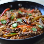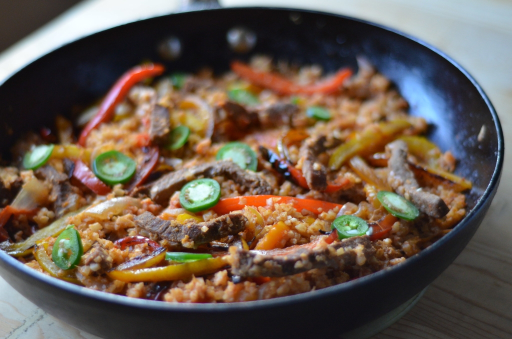 This recipe brings in all the yummy flavors of a fajita – the steak, the peppers, the onions, and pairs it with the zing of tomato paste, utilizing cauliflower instead of rice. And…it’s damn easy to make!