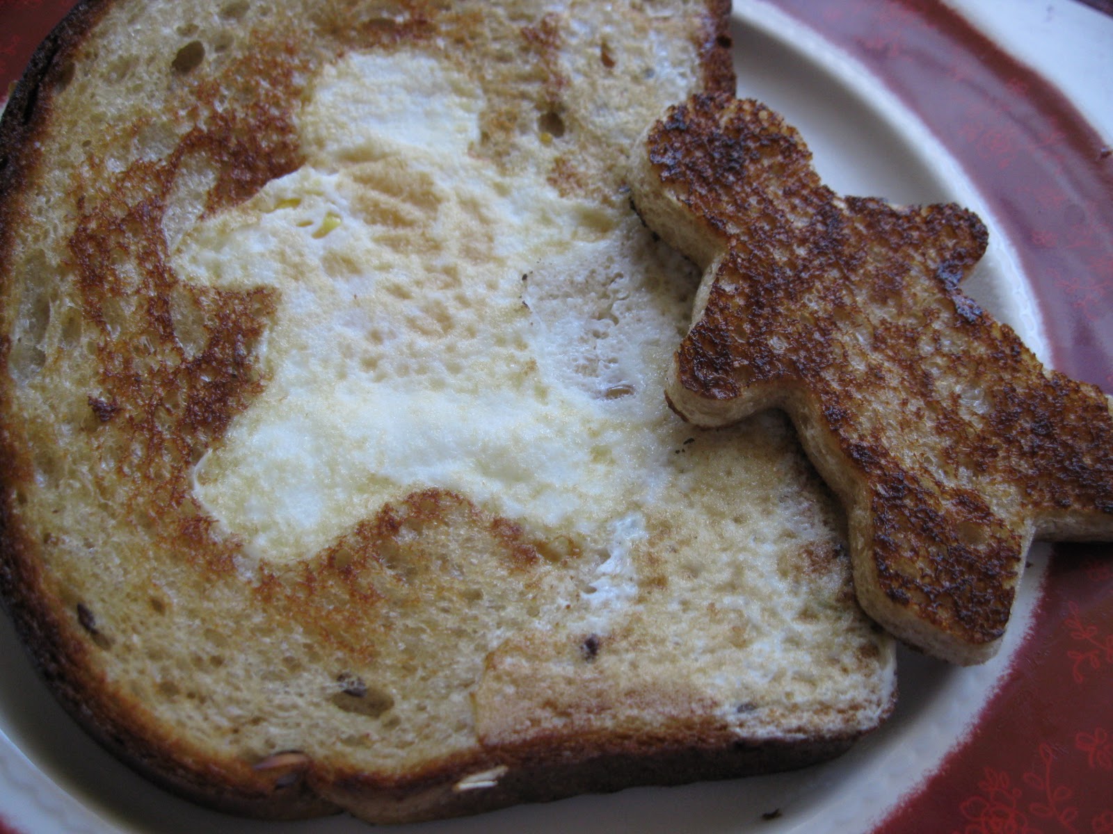 Remove the cooked “egg in the basket” to a plate and serve warm. Now we have two options with the cut-out pieces of bread. You can either butter each side and toast it in the pan now, like I did, OR you could make french toast out of the bread shapes and cook and freeze them for later in the week.