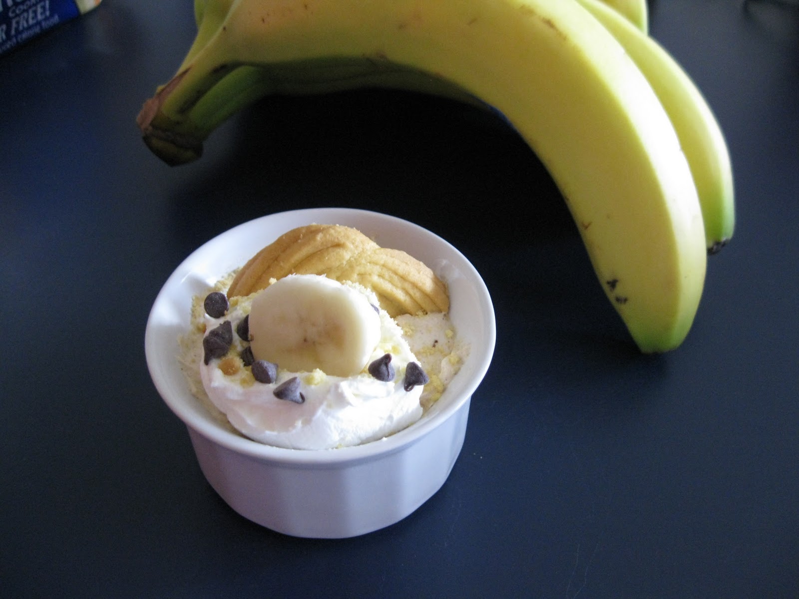 Assemble the pudding as follows: Place 1 cookie in the bottom of each ramekin, then 3 slices of banana on top of the cookies. Top with the pudding mixture. Garnish with whipped topping, chocolate chips, a banana slice, and the other cookie if desired.