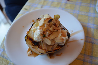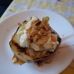 - To assemble the dessert, place a pear on a plate, fill the cavity with the ricotta/cheddar mixture, drizzle with caramel and top with toasted almonds!