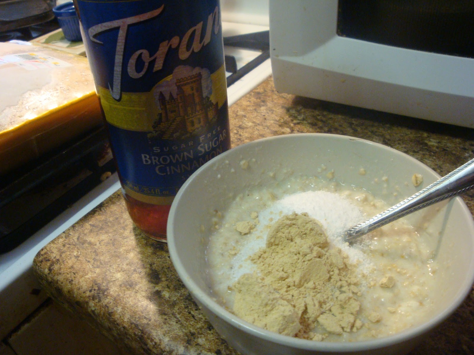 After you’ve prepped your oatmeal, add your salt, PB2, sweetener and syrup. Stir and…yummy!
