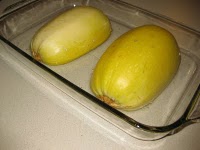 I love 'skettie squash! I cook mine in the microwave. First I cook the whole thing for about 5-8 minutes, depending on the size. This softens it up just enough so you can cut it in half lengthwise, those things are hard as rocks! Scoop out the seeds, place cut side down in a glass dish like you show with about 1/4" of water in the bottom. Cook on high for 8-10 minutes, again, depending on the size. I totally agree about letting that thing cool! One of the worst burns I've ever had was trying to skip that part! Once cool I use a big fork to scrap from side to side, along the 'grain' of the fibers. You can scrape it down to nothing but skin. Once everything is out, I use a few sprays of ICBINB, then add whatever sauce is called for.