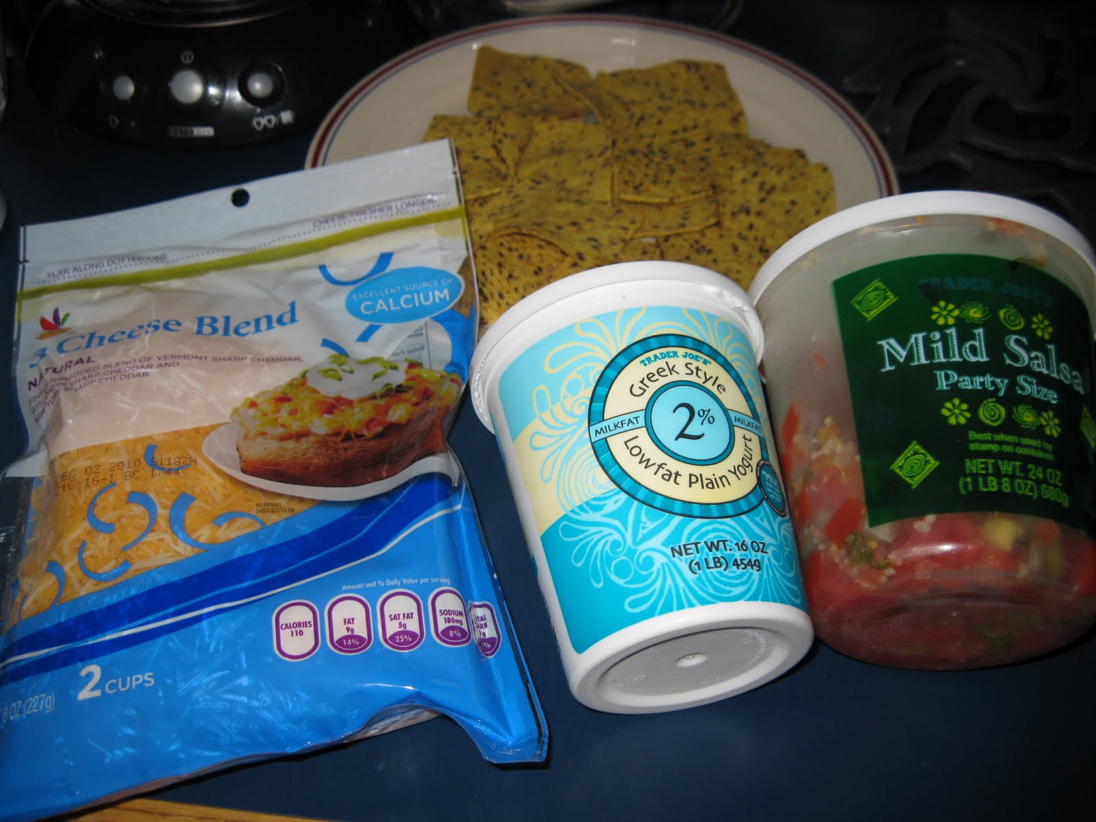 The first step was finding some chips with not too hideous stats. Trader Joe’s has their own brand of Soy Protein and Flax Tortilla Chips. The stats are pretty good for chips! A serving is 7 chips, 130 calories, 6 grams of protein, 9 grams net carbs (all whole grain).