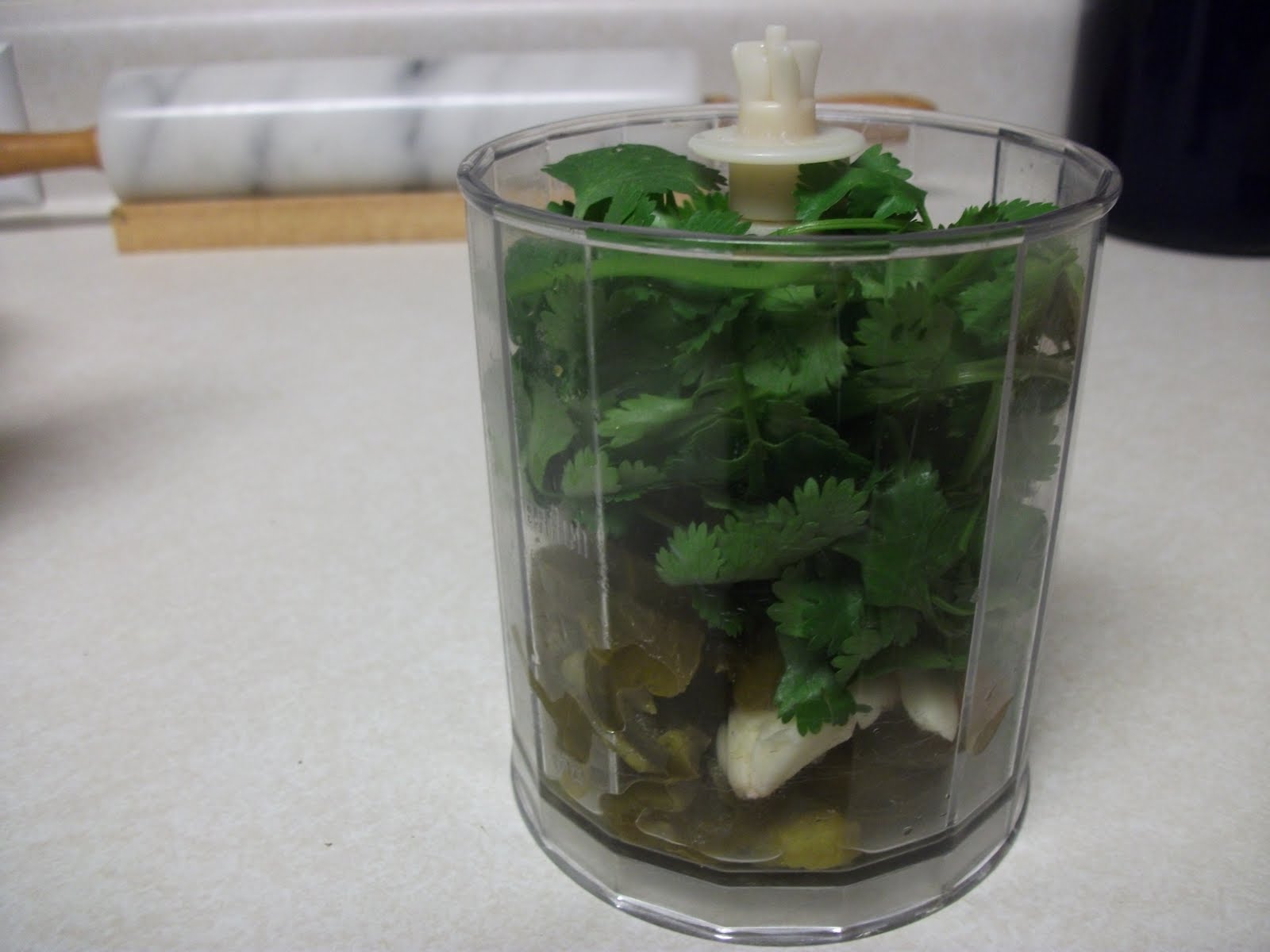 First, finely chop the jalapenos, cilantro and garlic. (I chop it in my mini-chopper with the juices)