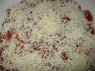 Spray a large lidded casserole dish with cooking spray (I used Olive Oil flavor) and spoon about 1/4 cup of marinara sauce in the bottom as the base (make sure the bottom of the dish is covered). Spread the first layer of eggplant slices over the sauce.