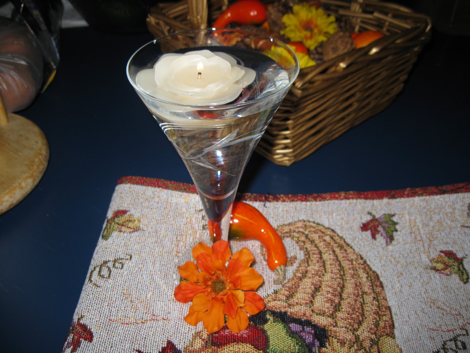 | Individual or Side Table centerpiece: wine glass with pinecones, pumpkins, & gourds inside and a few fall flowers around the base. Pretty and EASY!! |