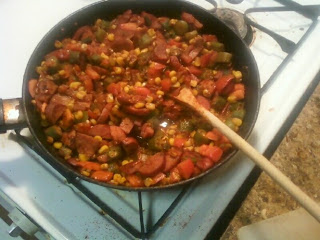 In a sprayed pan, cook the smoked sausage until you it is a bit blackened on both sides.