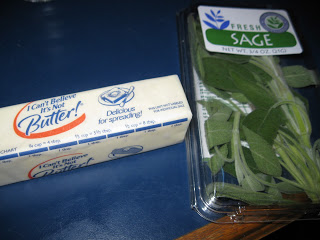 Preheat a non-stick oven safe skillet, add the butter substitute and olive oil. Let the butter melt, then add the fresh sage leaves and cook them for just a couple minutes. Remove the sage leaves and discard.