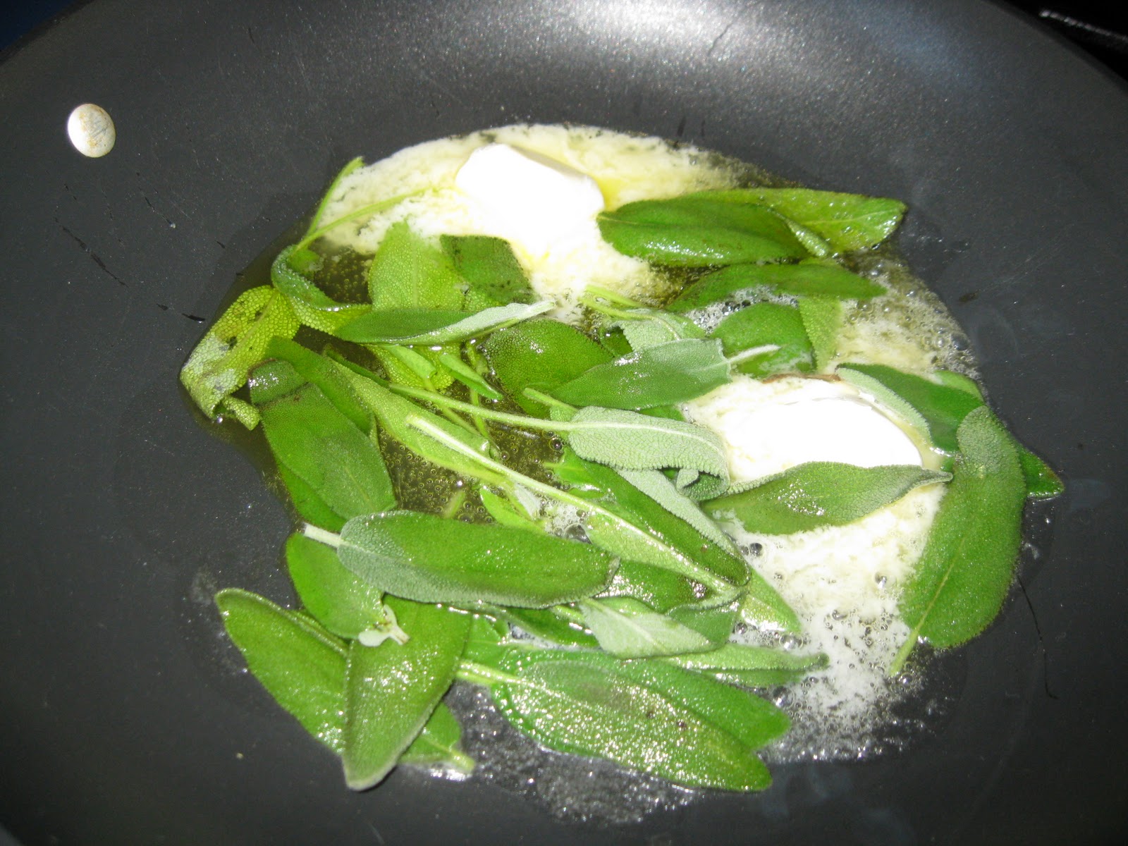 Preheat a non-stick oven safe skillet, add the butter substitute and olive oil. Let the butter melt, then add the fresh sage leaves and cook them for just a couple minutes. Remove the sage leaves and discard.