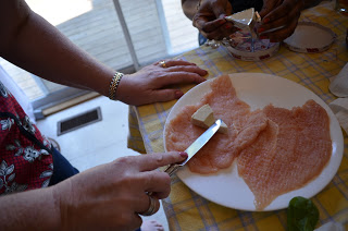 Margaret spreading the Laughing Cow cheese onto her pounded chicken breasts.