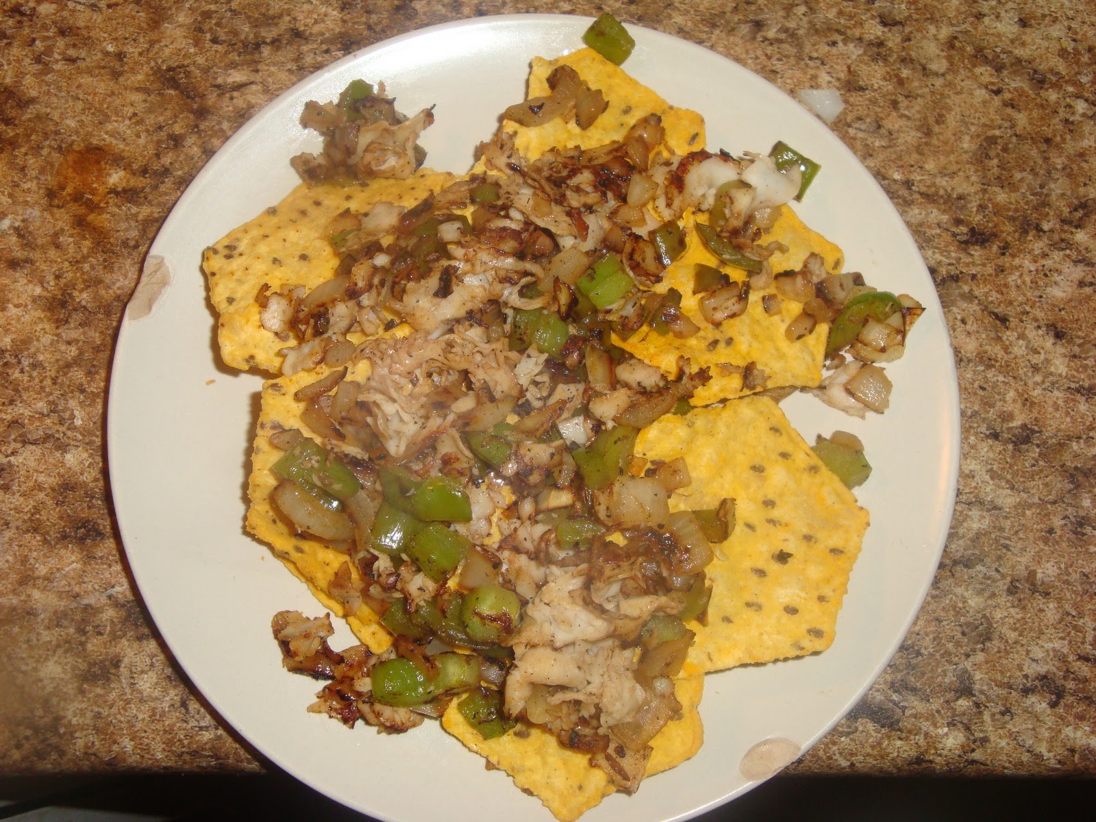 Lay out the chips on a plate, transfer hot meat/veggie mixture to the top of nachos and immediately sprinkle with cheese.