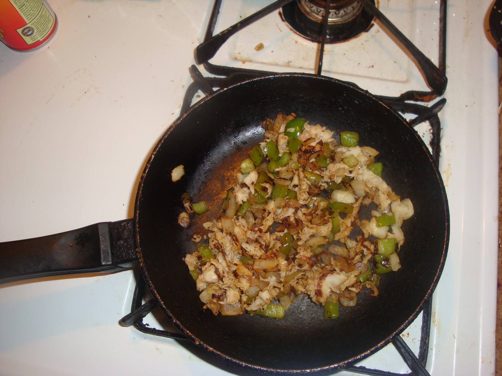 In a sprayed pan, brown up the deli meat, onions and peppers until the meat is slightly crispy. I used turkey here, but beef is fine as well.