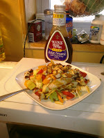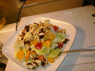 In a bowl, empty your salad mix and throw your edamame and half your almonds in there. Drain your mandarin oranges (BONUS TIP: if you’re ever in a place that doesn’t sell no sugar added canned fruit, get the kind in light syrup. Bring it home, drain into a collander and rinse the fruit. Then place it in a container and put a little of your favorite sugar substitute in it). Add those to the bowl. Now comes the fun part. SHAKE YOUR SALAD!