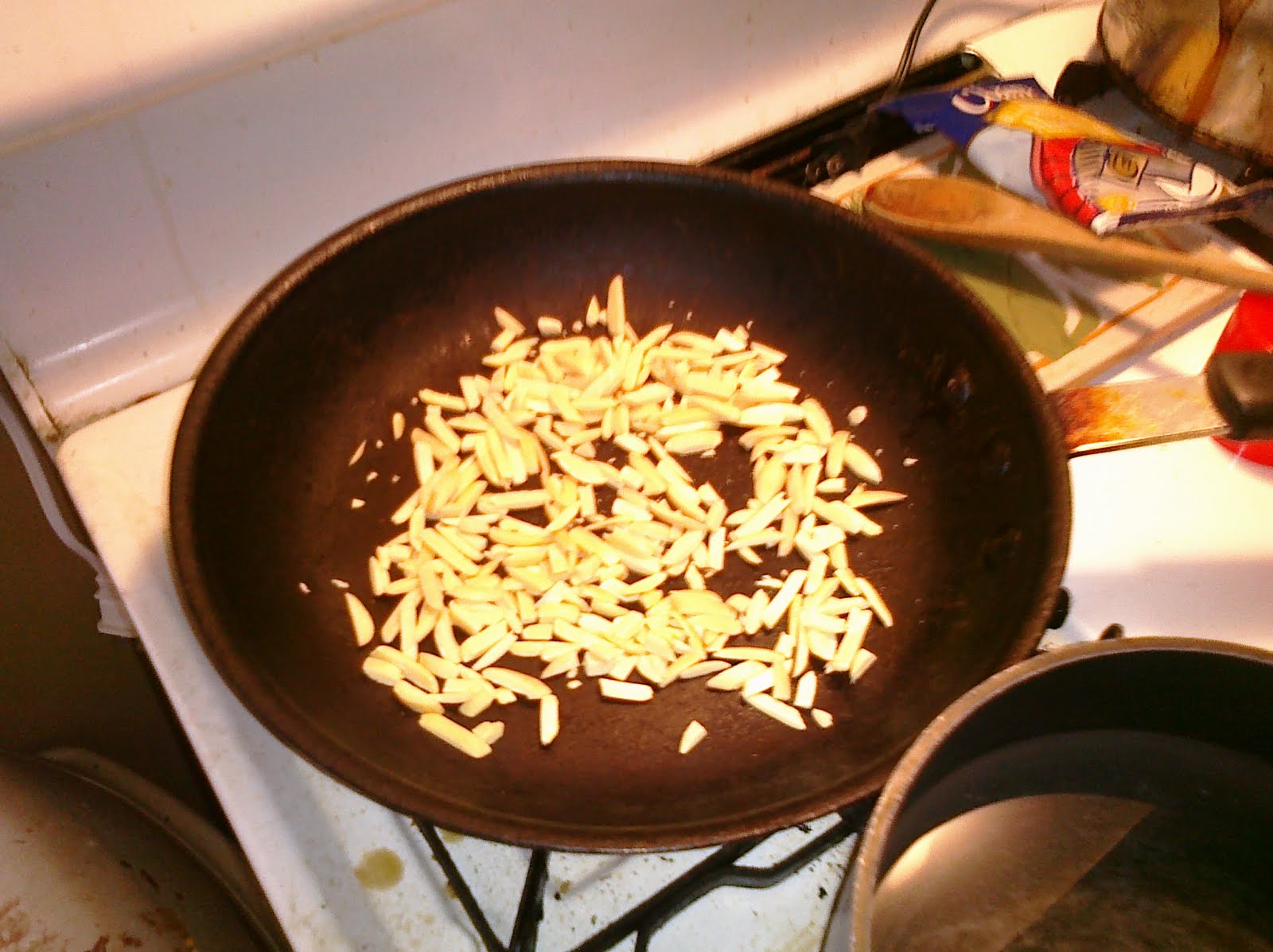 Set a DRY skillet over a medium flame and allow the pan to get hot. Empty your almond slivers into it. The key to toasting nuts (especially almonds) is to not overtoast them. You can tell when they are ready in two ways. #1 – they change color. Here’s my almonds just in the pan: