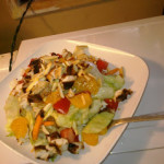 In a bowl, empty your salad mix and throw your edamame and half your almonds in there. Drain your mandarin oranges (BONUS TIP: if you’re ever in a place that doesn’t sell no sugar added canned fruit, get the kind in light syrup. Bring it home, drain into a collander and rinse the fruit. Then place it in a container and put a little of your favorite sugar substitute in it). Add those to the bowl. Now comes the fun part. SHAKE YOUR SALAD!