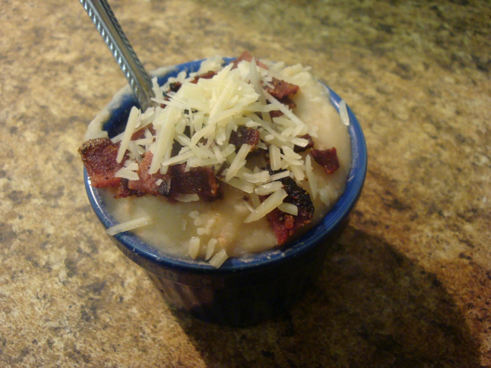 Once your soup is done, ladel out your little portion. Add to it about an ounce of whatever cheese you like (you all will not be surprised to know I chose fresh grated Parmesan which, to me, is the king of all cheeses) and either 1 slice of bacon (pork, turkey, soy…your choice) or 1 tbsp real bacon bits.