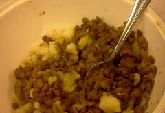 Lunch: 1 c. curried lentils (with the modifications I discussed yesterday) + 1/2 c. cauliflower rice (70 cents)