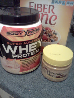 Now about the peanut butter. I use Naturally More peanut butter. It’s sold at Wal-Mart (right there alongside the other peanut butter options). Here are the stats on it. As you can see it has a few less calories than regular peanut butter BUT it also has: a better source of fat (they took out the peanut oil and replaced with flax seed oil), more fiber (from the whole flax seeds included) and more protein (they add egg whites in there some kinda way…I don’t ask questions).