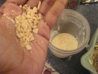 Magic Bullet Blender) and throw your TVP in. Pulse until it is the consistency of bread crumbs. Here’s what it looks like before (in my hand) and after.