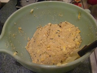 Mix the TVP into the zucchini mixture thoroughly and let THAT sit about 5 minutes. The TVP should absorb the liquid from the zucchini and what you should be left with is a ball of mixture that looks something like this.