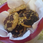 Now at this point I was able to form them into patties but the spirit of my long-gone grandmother kept pestering me to put an egg in it. Cuz…you know…that’s what you do! I honestly believe, though, that it is possible to cook this without the egg, thereby making the fritters vegetarian.