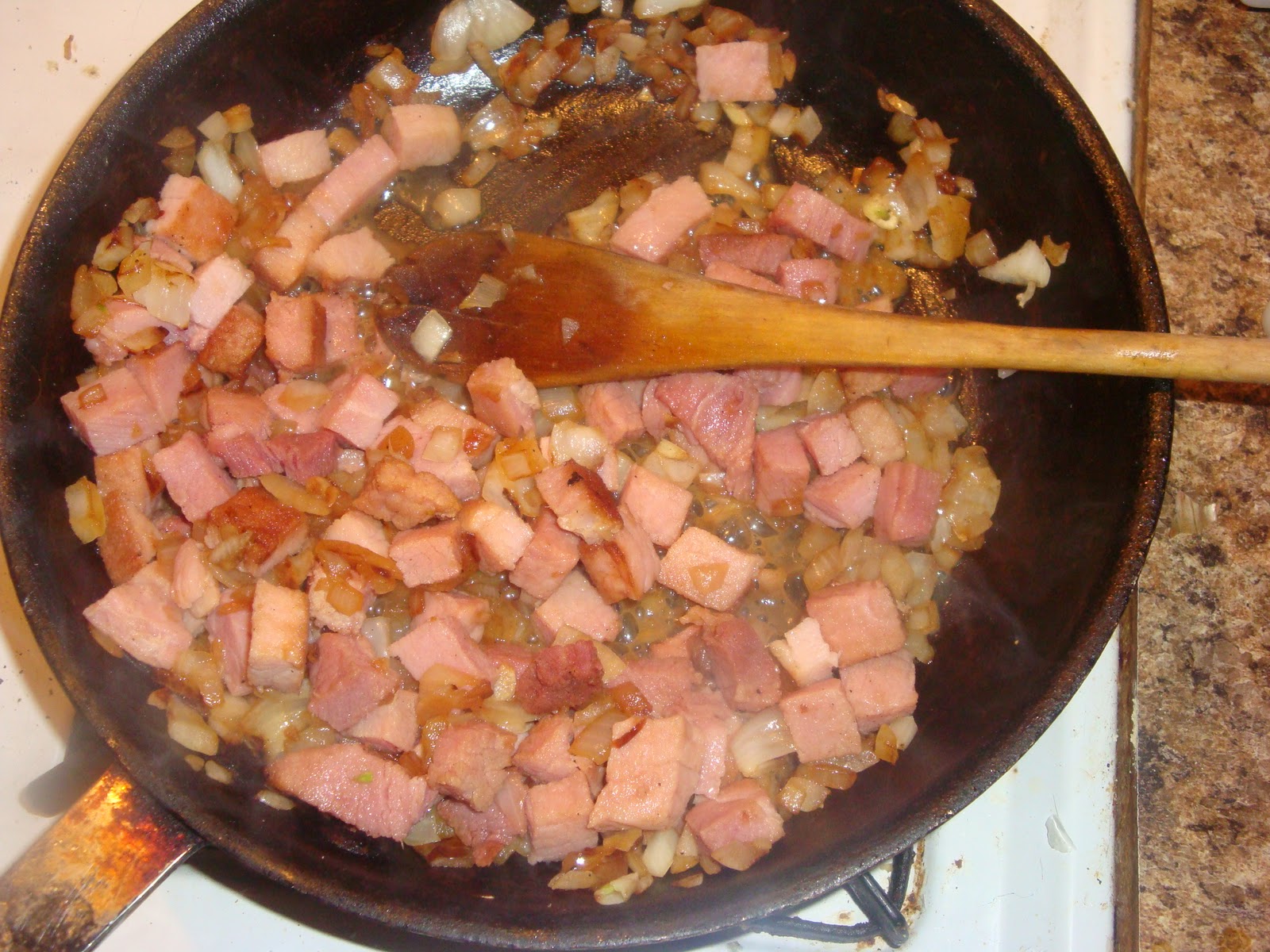 So here’s how it goes down. In a sprayed pan, you want to get your onions and garlic “sweating.” Once they’ve got some good color to them, add that ham in. A word about the ham. It’s completely up to you whether to use pork or something leaner like turkey ham. I’m a bit of a purist so I use pork but I cut it from a ham steak. Why? Because the fat is more easily visible and you can trim it, whereas if you use a ham bone, you can’t extract the fat as easily. Excessive amounts of animal fat makes me queasy. Your mileage may vary.
