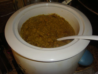 So once the ham is browned up a bit, add the broth to the pan to help scrape up the bits stuck to the pan. That’s where all the flavor is! Once you’ve got the “good stuff”, transfer the party over to your crock pot. Add your peas, stir and turn your crockpot on (I use the high setting. Whatever setting usually yields finished food in about 5-6 hours on your crockpot…use that).