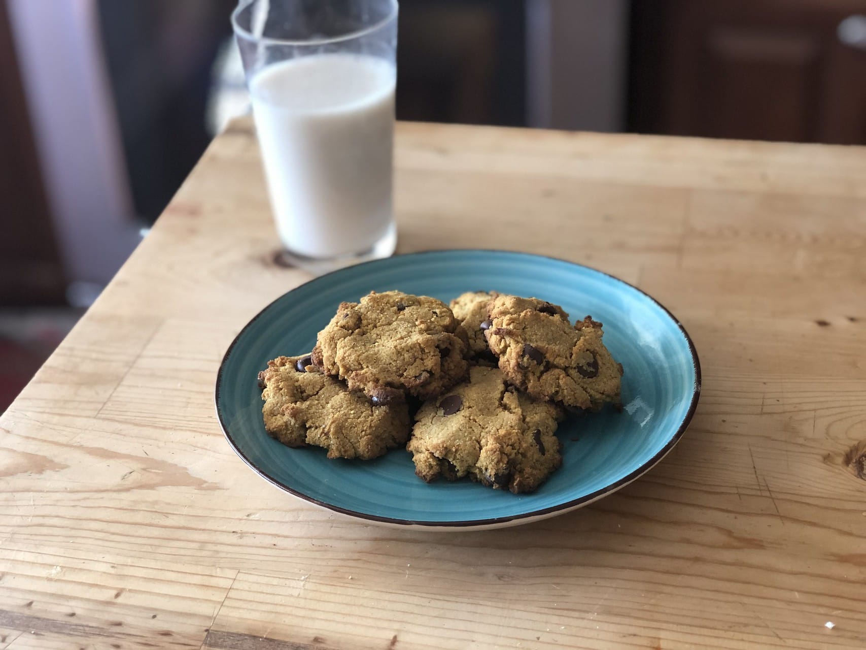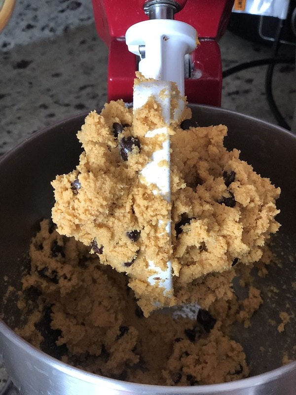 - In a separate bowl, combine almond flour, coconut flour (and protein powder, if using) and baking soda, and salt and mix well. Add to the wet ingredients and mix until a dough forms. Add sugar-free chocolate chips.