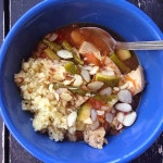- To serve: place a small amount of couscous/quinoa/rice/whatever in a bowl. Ladle some stew on top of it (for your portion, you get to choose how much broth, as I know some folks worry about taking in liquids and solids together). Top with sliced almonds and enjoy!